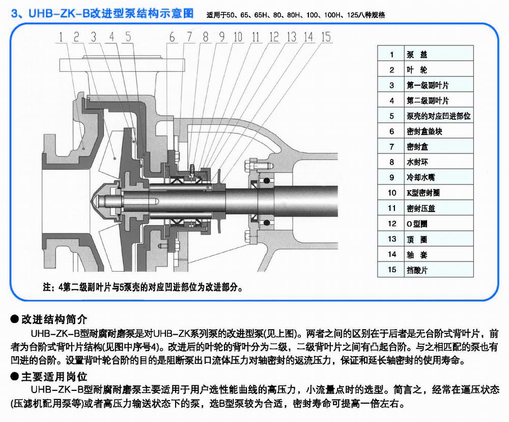 5.UHB-ZK系列耐腐耐磨泵,可根據用戶(hù)的要求安裝不同的密封。若無(wú)特殊要求,一般均裝配K型動(dòng)力密封。