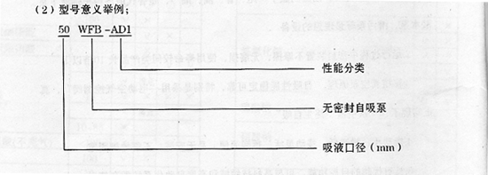 3.完整的型號書(shū)寫(xiě)方式。假設水泵的要求是:造型為推車(chē)型,材質(zhì)為增強聚丙烯,吸液口徑為50mm,性能分類(lèi)為AD1。這臺水泵的完整型號為“5PP50WFB-AD1”